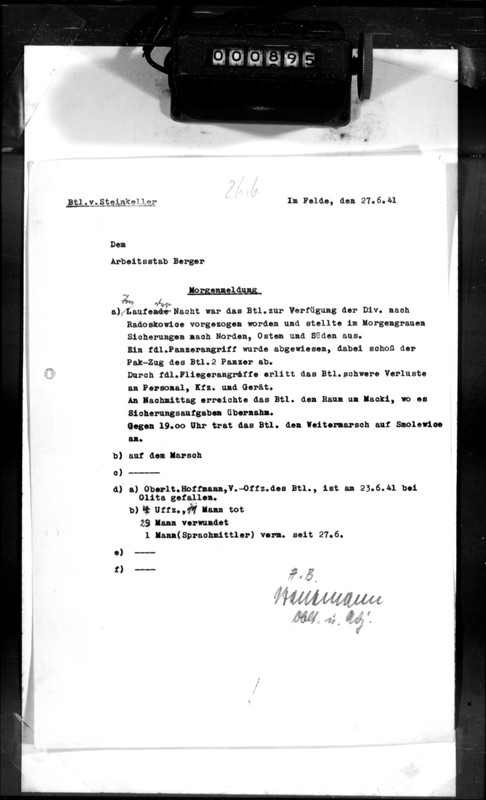 «Мотомехчасти противника отдельными колоннами сосредотачиваются в районе Молодечно – Ошмяны. Погода: ясно, видимость 10 км. 140-й СБАП в течение дня 26 июня последовательными ударами эскадрилий уничтожает скопление мотомехчастей в районе Молодечно – Ошмяны.